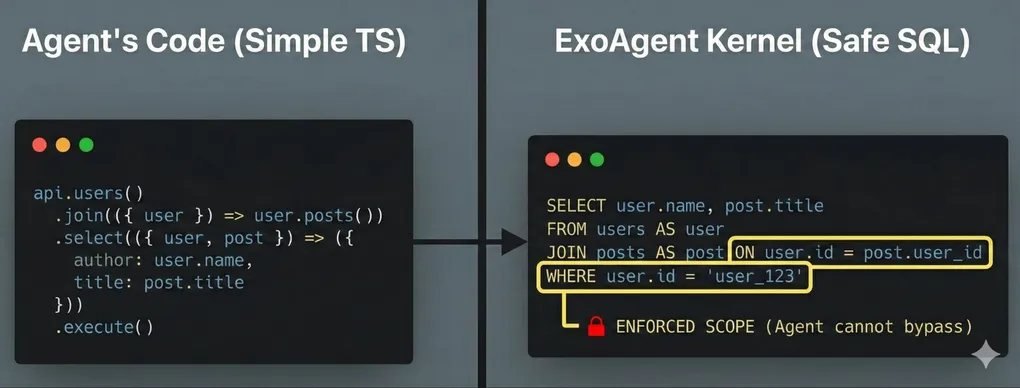 The agent never touches SQL strings. It composes queries through typed objects that cannot express unauthorized access.